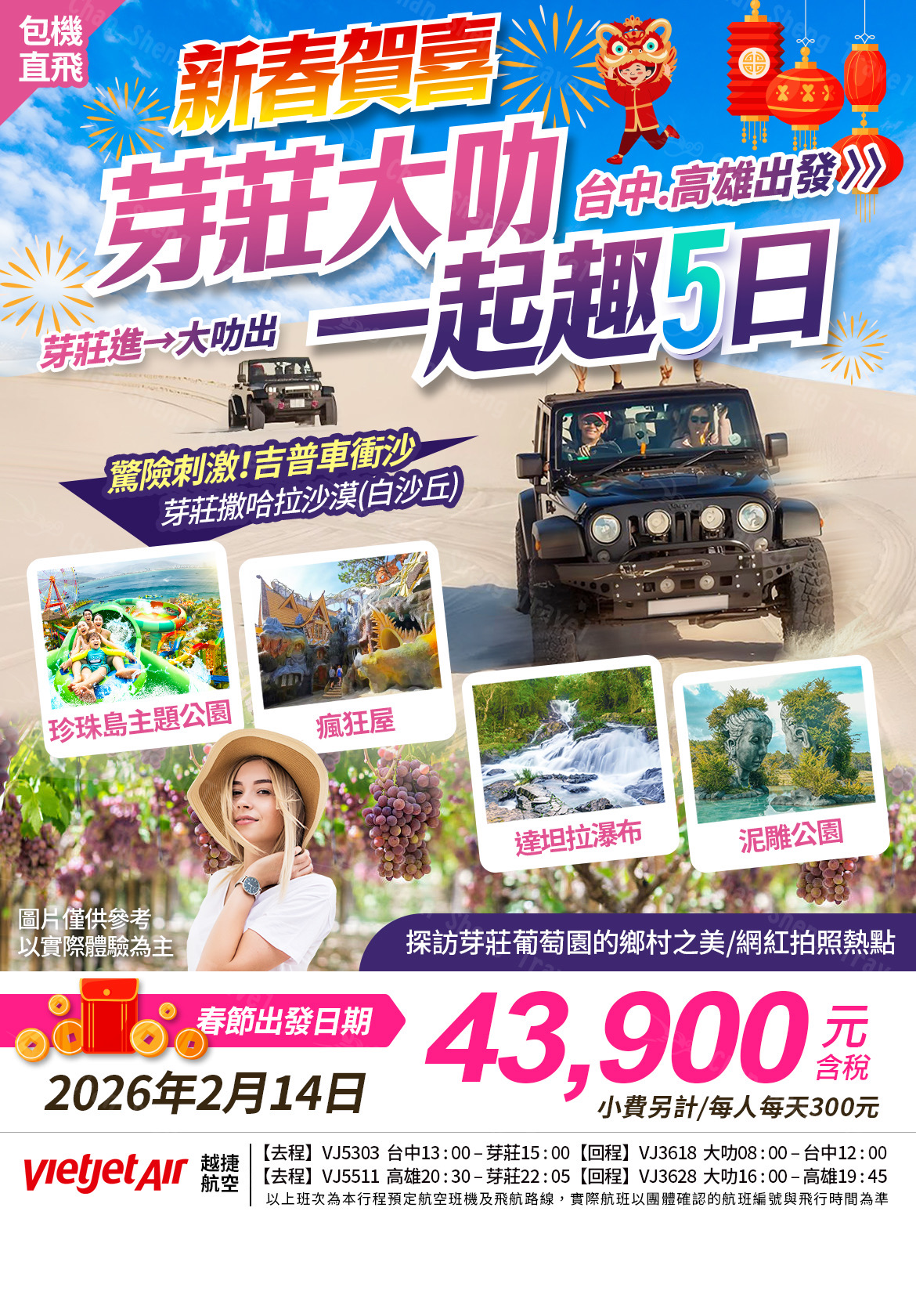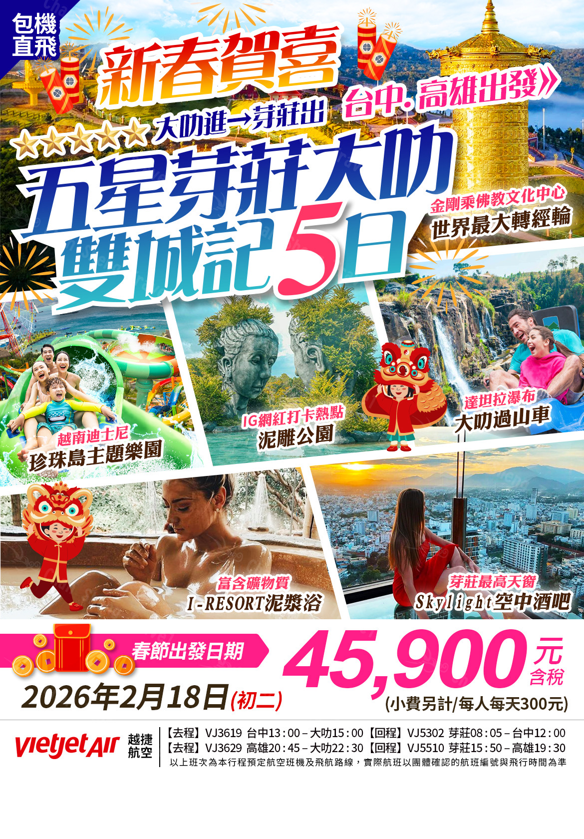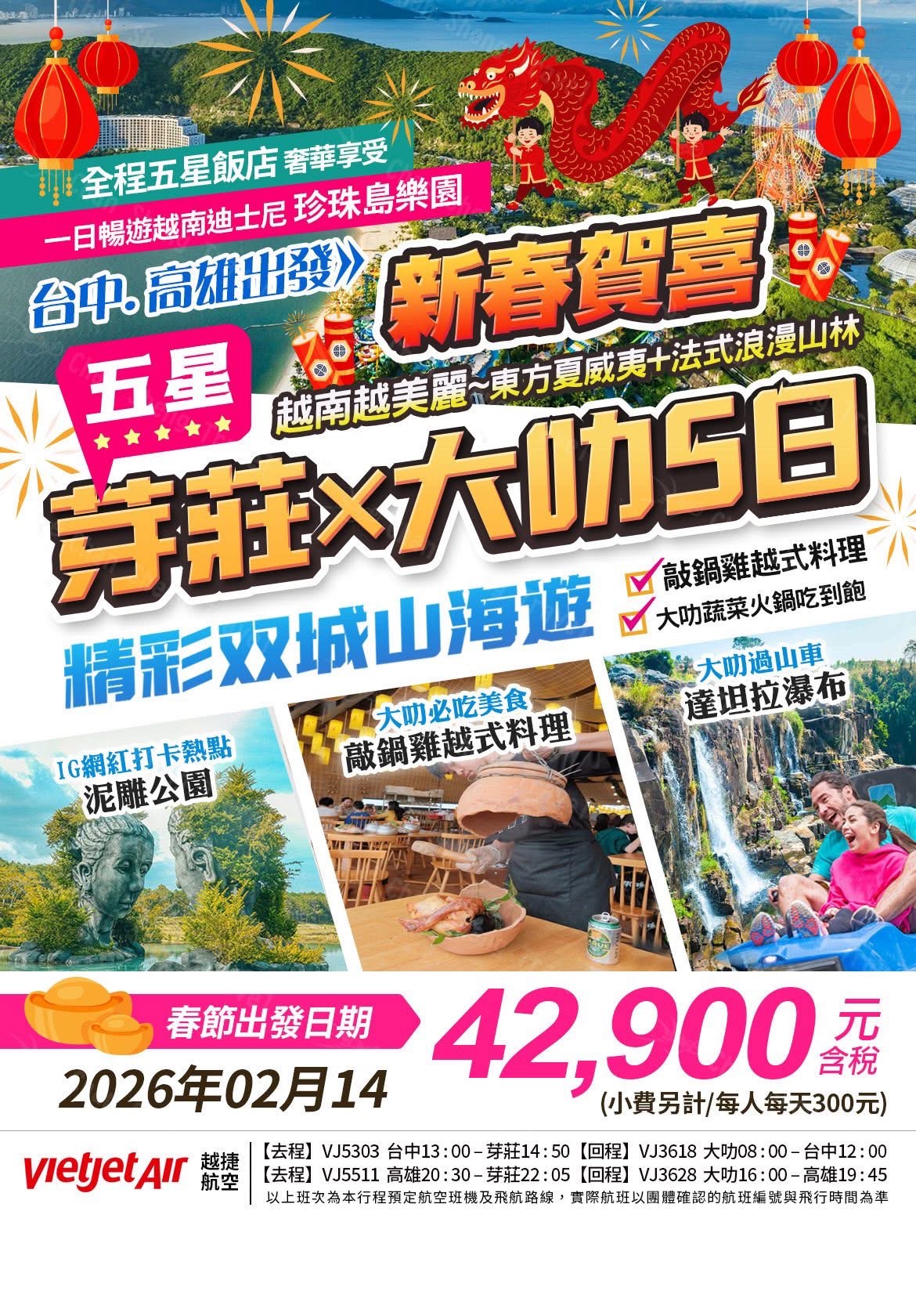 ⭐️【新春賀喜~芽莊大叻雙城5日】⭐️ ✅越南迪士尼~珍珠島主題樂園 ✅IG網紅打卡熱點~泥雕公園 ✅大叻過山…