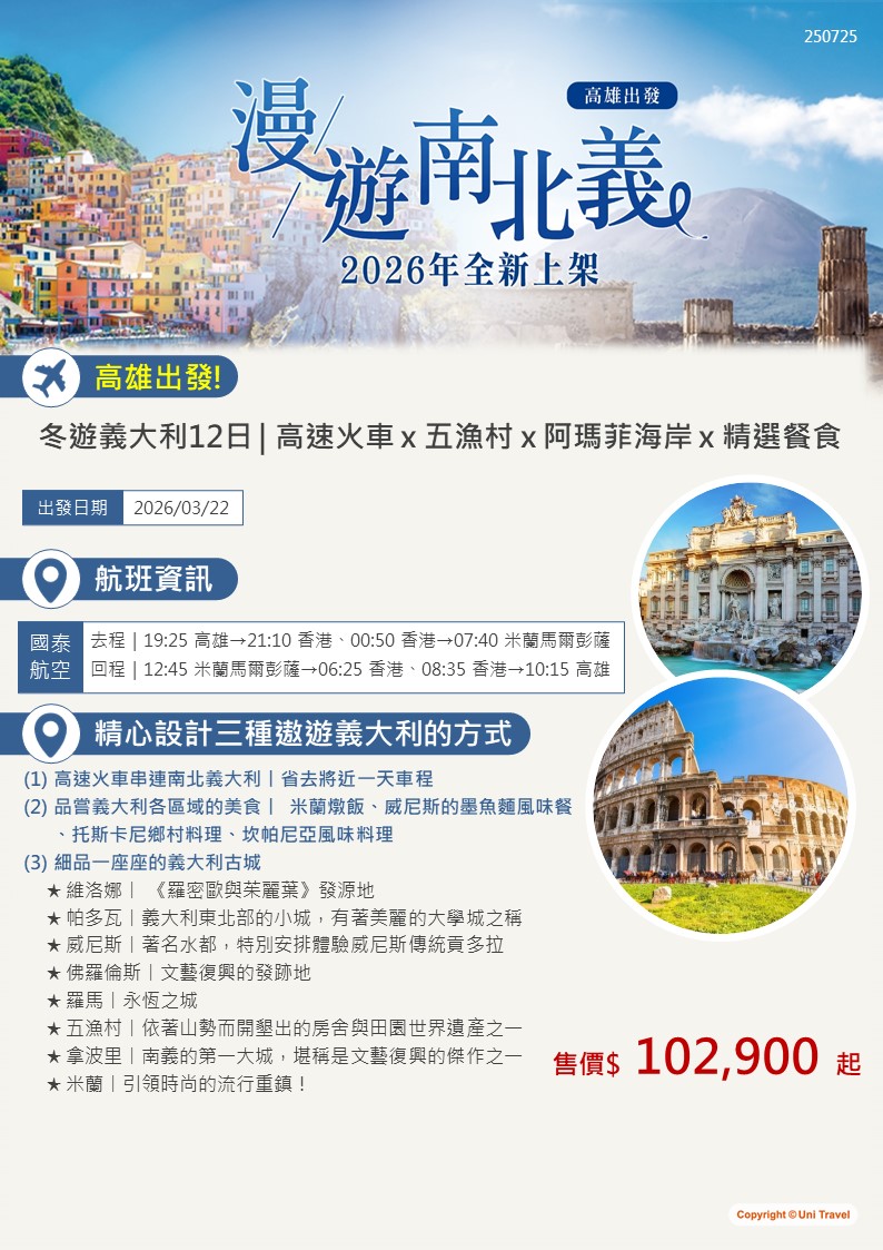 🌍已成團 ~ 漫遊浪漫南北義 高速火車12日 高雄出發🌍 🛫國泰 高雄19:25/香港21:10、香港00:5…