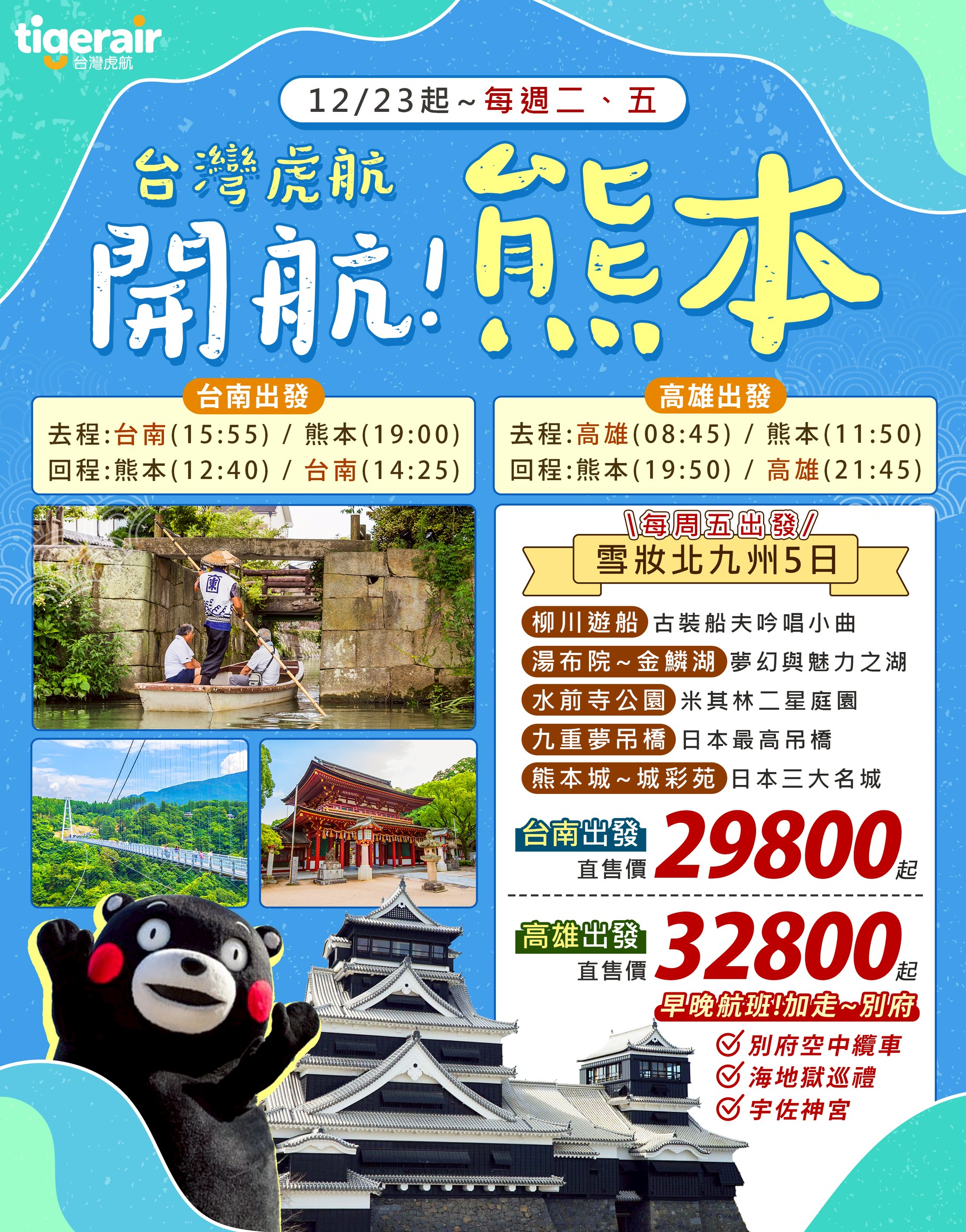 什麼!🔥虎航飛熊本啦🔥 📌12/23起~每周五出發 ⚡高雄、台南~雙線齊發⚡ 高雄出發📢雪妝北九州5日 📣32…