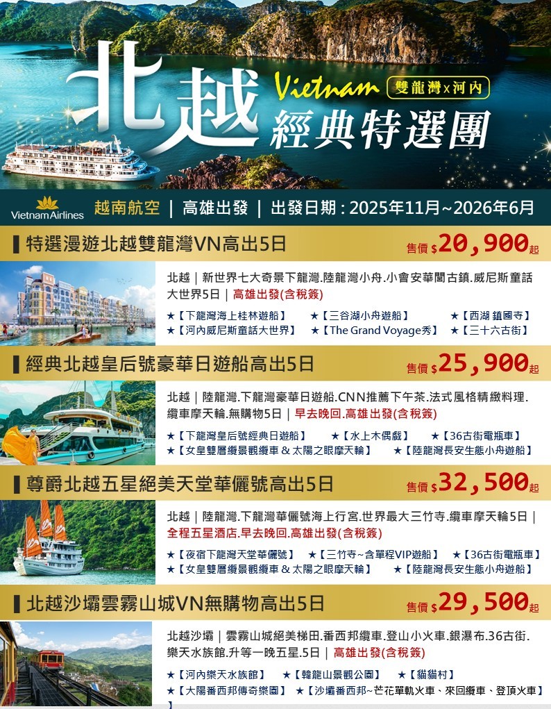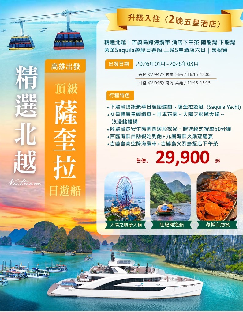 🏝️新商品上架 北越吉婆島奢華薩奎拉日遊船高出6日 🏝️ 🛫越捷航空 16:15高雄/18:05河內、11:4…